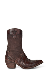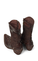 Den bruna stjärnstöveln från det italienska märket Fauzian Jeunesse är en unik, handgjord westernstövel i läder och mocka. Med sin karakteristiska stjärndetalj, präglade mönster och autentiska cowboysilhuett kombinerar stöveln italienskt hantverk med ett rått, bohemiskt inspirerat uttryck. Den låga klackhöjden på ca 4 cm ger komfort, medan det exklusiva materialet säkerställer en stövel som bara blir vackrare med tiden.