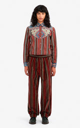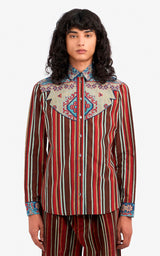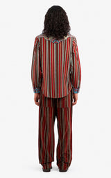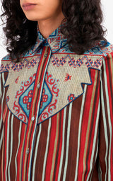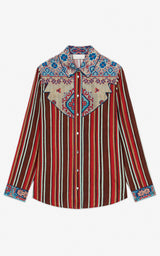 Cool westerninspirerad skjorta med breda ränder i rödaktiga nyanser och ett bröst och ärmslut i ett mer blåaktigt mönster.