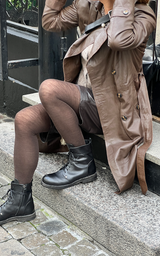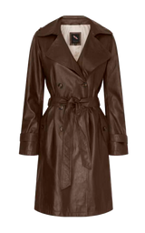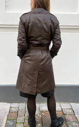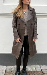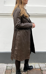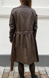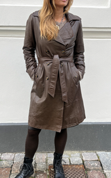Denna vackra trenchcoat i mörkbrunt läder är den perfekta övergångskappan. Supermjuk och i perfekt färg för din höstgarderob. Den är dubbeldraperad och har ett fint diskret mönster på knapparna.