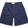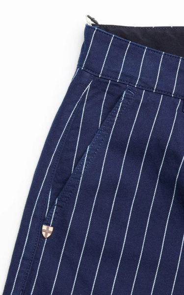 BCupra Toll Shorts från Blue de Gênes är shorts med avslappnad passform, inspirerade av arbetskläder, i randig bomull 260 g/m² med en mjuk finish. Shortsen har en veckad framsida, snedställda fickor, knappknäppning med korozomönster, gylf med dragkedja och broderi av Blue de Gênes-flaggan. Kan stylas med en matchande jacka eller väst.