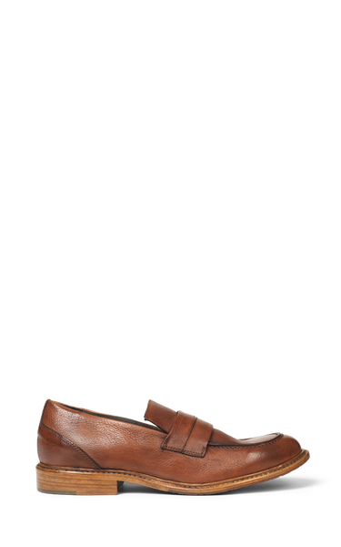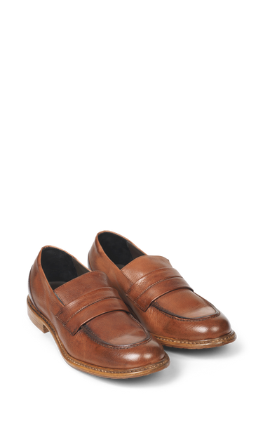 Vackra klassiska loafers i tvättat cognacsläder. Skorna har vackra sömmar och ett bälte över foten.