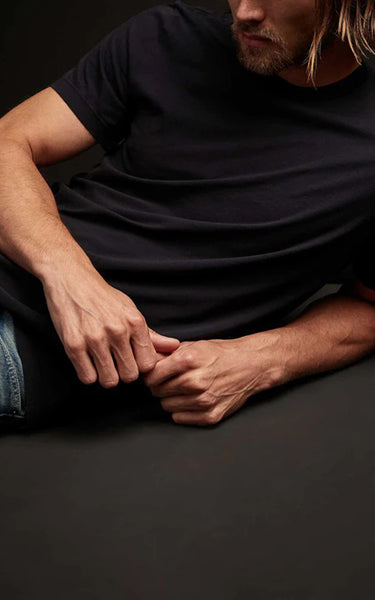 T-shirt i en mycket mörkblå färg med korta ärmar och knuten halsringning från James Perse. Denna lätta jersey är en extremt mjuk bomullsstickning tillverkad genom att specialbehandla bomullsfibrer innan de spinns till garn. Detta tyg andas bra och har en fin täckning. Din framtida favorit-t-shirt.