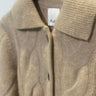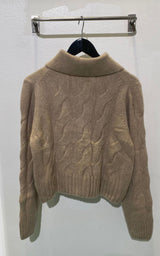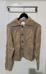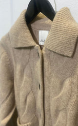 Mjuk, grov kofta i en varm beige melerad ton. Den har ett klassiskt kabelstickat flätmönster, knappar fram och en fin krage som ger den en avslappnad men sofistikerad look. Koftan har en något beskuren längd, vilket gör den perfekt över klänningar, skjortor och byxor med hög midja. En tidlös vardagsfavorit som både värmer och lyfter din look.