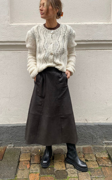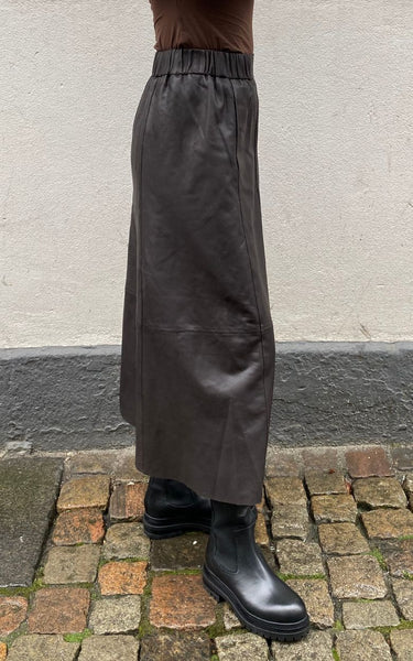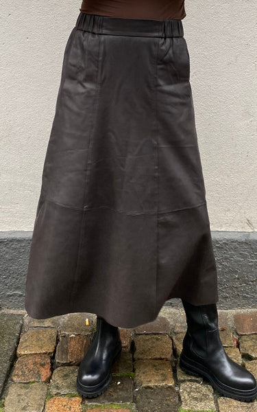 Cool skinnkjol i A-form i en vacker mörkbrun färg. Kjolen har resår i midjan och fickor på sidan. Perfekt att styla med stövlar för vardagsbruk eller vackra stilettklackar för fest. En klassiker i din garderob som alltid är lätt att styla.