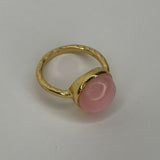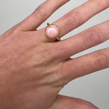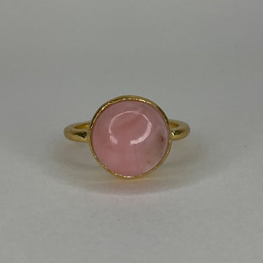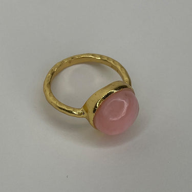 Vacker guldpläterad ring med en stor rosa opalsten. Ringen har ett enkelt och elegant uttryck.