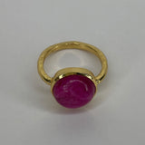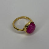 Vacker guldpläterad ring med en stor lila/rosa rubinsten. Ringen har ett enkelt och elegant uttryck.
