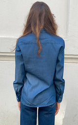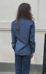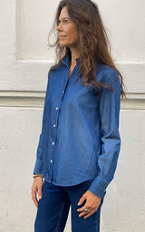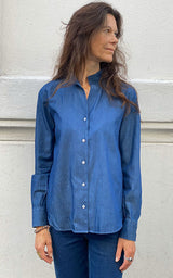Den vackraste Brooke-J-skjortan i denim från Bagutta. Skjortan har en fin tulpankrage, pärlemorknappar i mitten och vid handleden som en fin detalj. Den vackra skjortan har en fin lös passform och är tillverkad i det vackraste denimmaterialet.