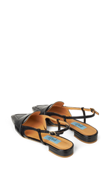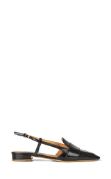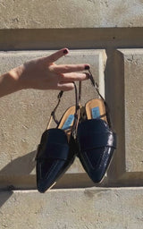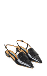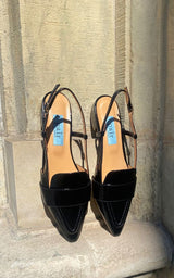 Underbara spetsiga skor med liten klack och slingback. Vackert kalvskinn med svart lackskinn.