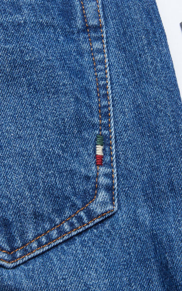 Broderi av italiensk flagg på höger bakficka och en nit av Blue de Genes-flaggan på höger framficka.